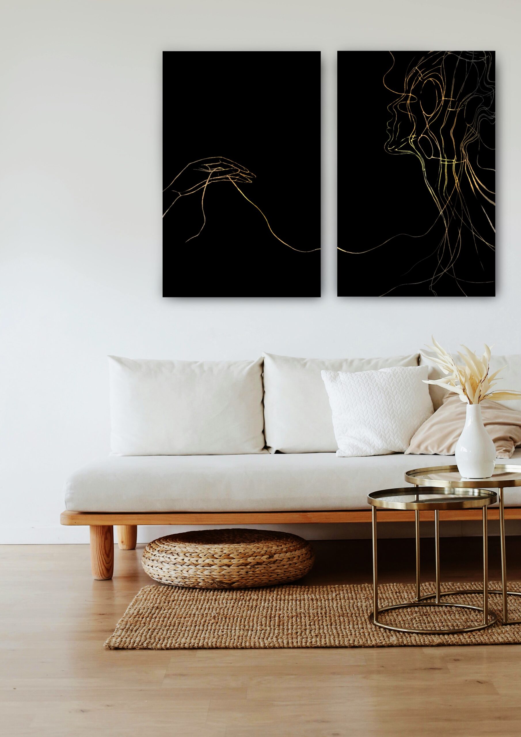 Digital art “Gravity” is a diptych, which is an abstract image in the form of lines, symbolizing the force of attraction. The elongated lines of a woman’s profile on a dark background symbolize forward movement. They become increasingly thin to present the illusion of endless movement and to evoke a sense of attraction and attraction. The painting reflects the sense of inevitability of moving forward despite the unknown that lies ahead. The girl personifying the power of attraction is a symbol of human will and the desire for progress and the new. The hand holding the string as a symbol of attraction expresses the idea of the power and influence of the human mind, energy and will.
